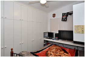 Near the kitchen is the second bedroom with handy shelving and BIR.