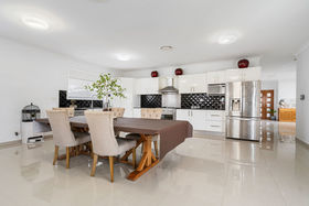 The home features four generous bedrooms, three with built-in wardrobes and a walk-in robe to the main, complemented by high ceilings and tiled living areas. A large formal living room provides a separate retreat, while the expansive 6.8m x 9m open-plan kitchen, dining and family room forms the heart of the home.